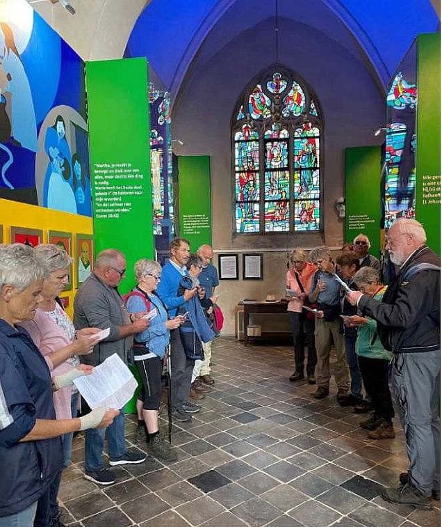 De pelgrimswandelaars lezen gezamenlijk het gebed van Marinus van den Berg ‘Mensen hebben mensen nodig om elkaar te dragen, om elkaar tot leven te brengen’.