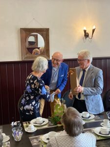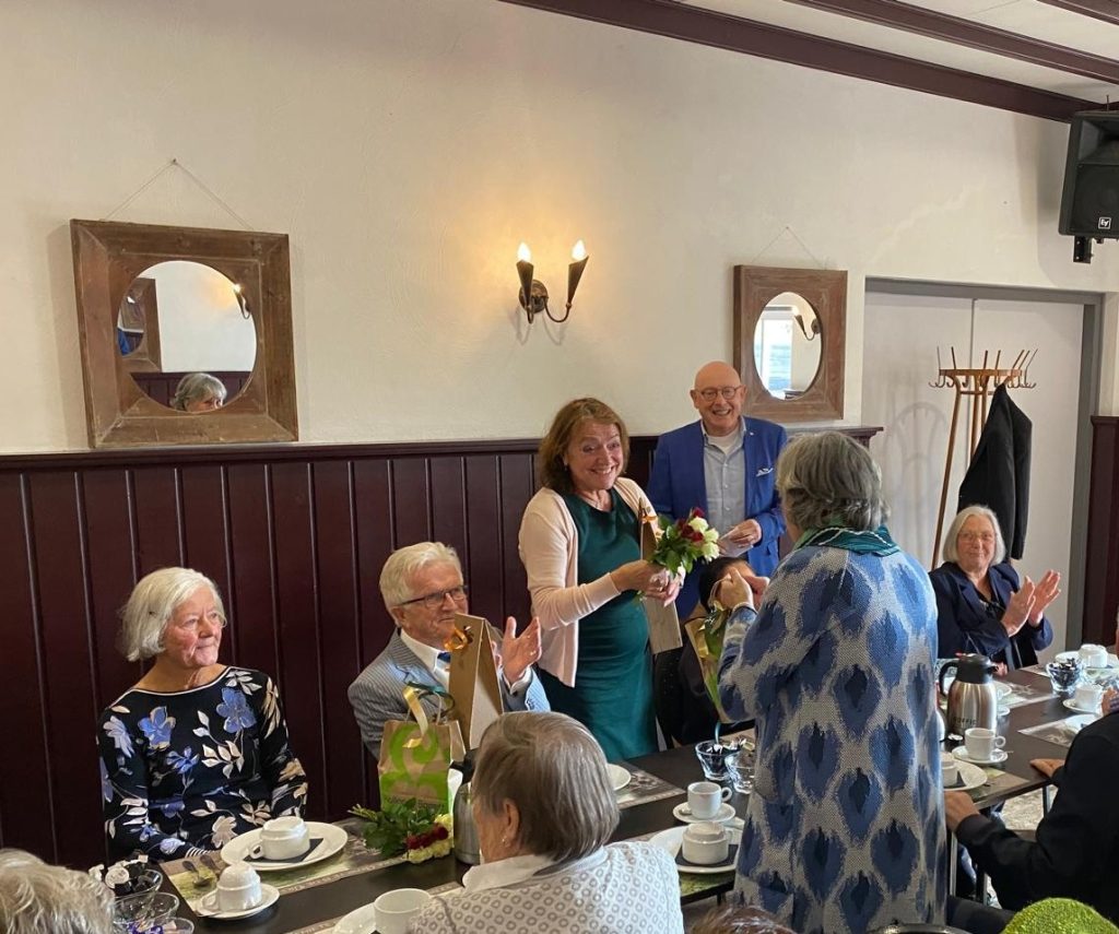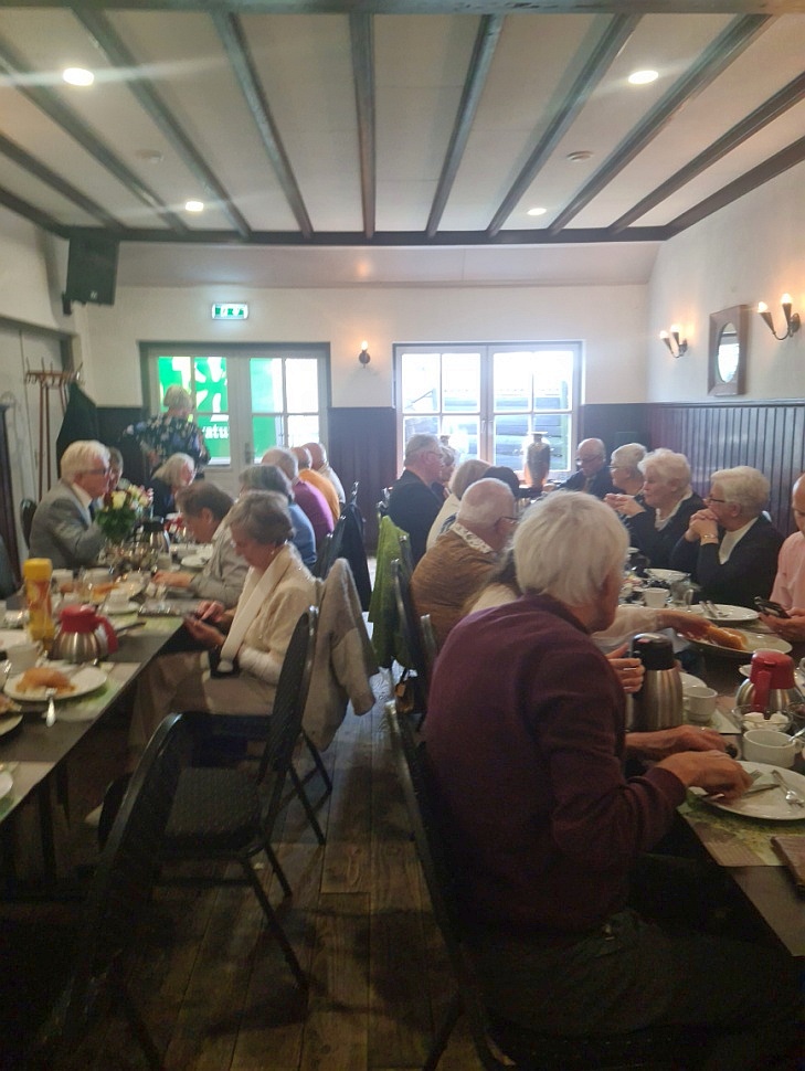 De zoals altijd voortreffelijke lunch in Café ’t Dörp in Broekhuizenvorst, waaraan ook het koor deelnam, zette het feestgevoel fijn voort. Tijdens die lunch werd door voorzitter Harry Schraven de laudatio uitgesproken voor de scheidende bestuursleden Gérard Peters (penningmeester) en Lau Engels, die resp. 16 en bijna 6 jaar deel uitmaakten van het bestuur. Als dank voor hun jarenlange trouwe inzet werden aan hen en hun echtgenotes enkele attenties aangeboden. Het waren voor alle aanwezigen emotionele momenten.