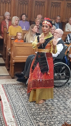 Voorafgaande aan het aandragen van de gaven door kinderen en volwassenen lieten vier Indonesische vrouwen ons weer genieten van een symbolische dans als gebed en eerbetoon.