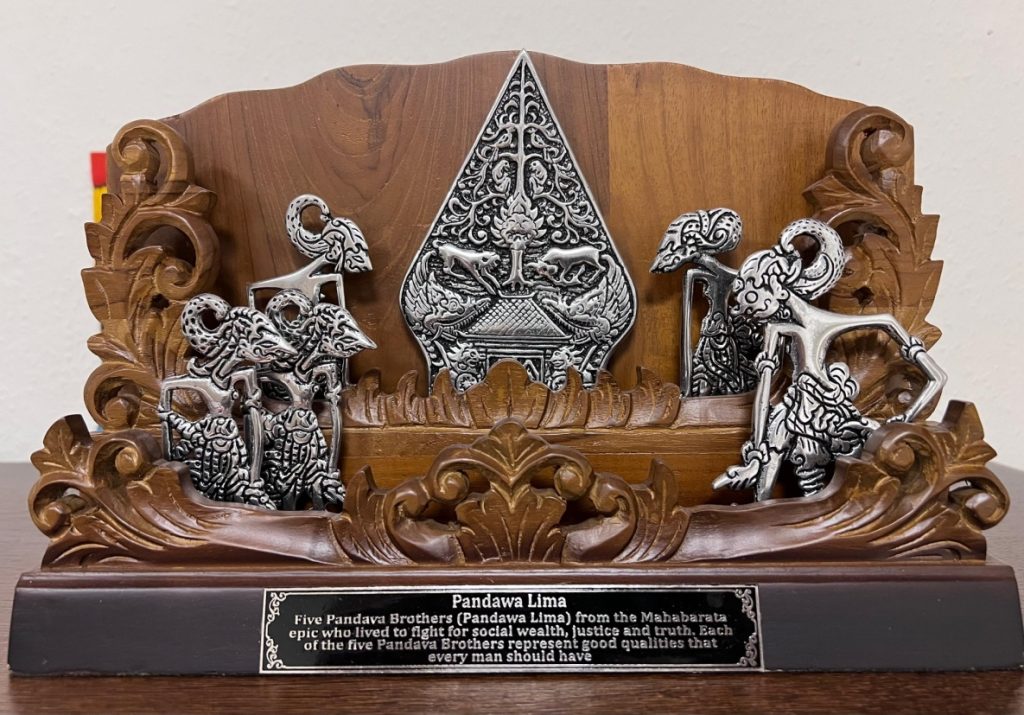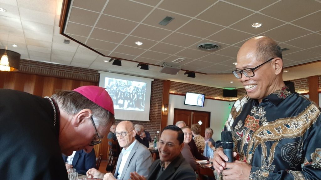Tijdens het diner werd door de overste, pater Rafael, namens de congregatie een geschenk aan bisschop van den Hout overhandigd – die moeite moest doen om het cadeau uit te pakken….: twee boeken over de geschiedenis van de missie van de Lazaristen en een reliëf van Japanse schaduwpoppen.