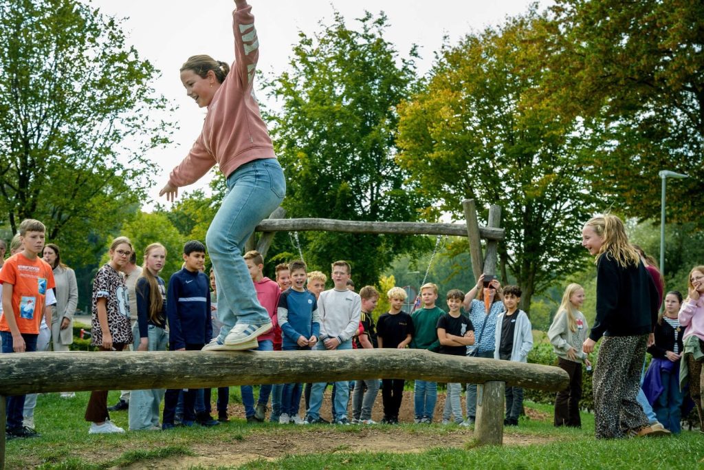De leerlingen van groep acht van De Meridiaan zijn maandagmiddag – na een openingswoord van sportwethouder Naomi Yogi-van Loon en het doorknippen van het lint – de eersten die de wandelroute lopen. Zij laten op de evenwichtsbalk meteen zien hoe het moet. Daarna lopen ze door naar verpleeghuis de Rode Beuk, waar ze met ouderen iets drinken en eten. De hoop is dat ook na vandaag mensen uit verschillende leeftijdscategorieën elkaar op de route ontmoeten, aldus de wethouder.