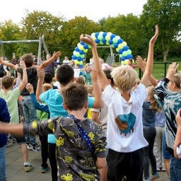 Voordat er gewandeld kan worden, doen de kinderen van basisschool De Meridiaan een warming-up. © Rob Oostwegel